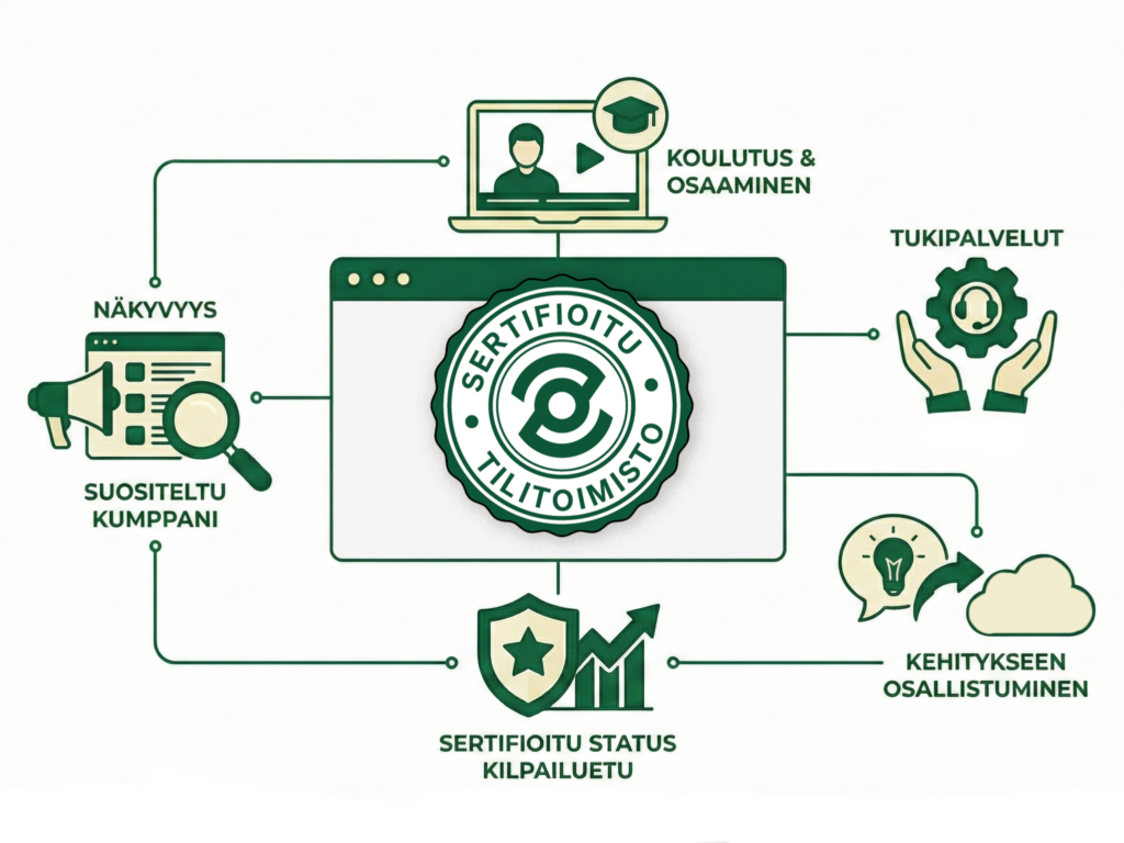Koulutuspaketti: Sertifikaatti on yrityskohtainen, ja yrityksen henkilöstön tulee käydä tilitoimiston koulutuskokonaisuus osaamisen varmistamiseksi.